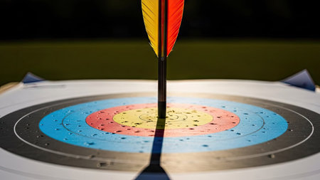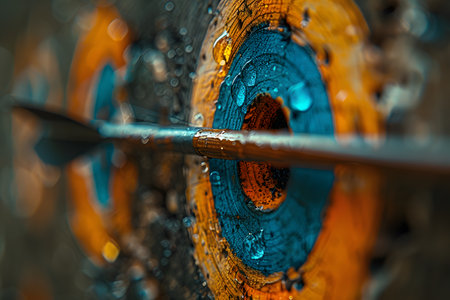 Close-up image of a bullseye from an archery target, partially wet from raindrops. an arrow is seen striking the center with precision, intense focus and accuracy. perfect for themes on sports, success, determination, and perseverance. Generative AI
