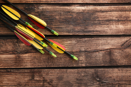Plastic arrows and space for text on wooden table, flat lay. archery sports equipment