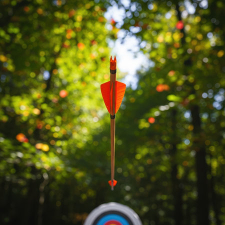 An arrow striking the center of a colorful archery target in a serene outdoor environment during daylight