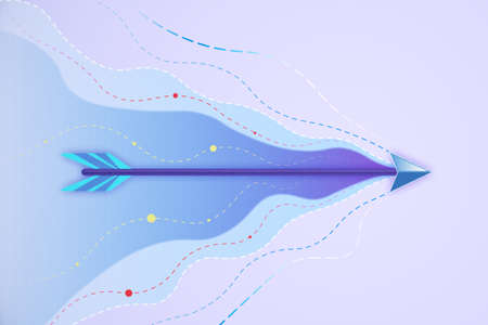 Speed technology and innovation concept with blue shades flying arrow leaving a trail of lines on abstract light purple background. 3D rendering