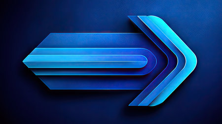 Stylized, three-dimensional arrow, with overlapping layers of blue hues, is set against a dark, textured background. The graphic effect implies depth and a modern design aesthetic.