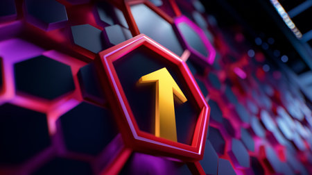 Rotating hexagonal wall features illuminated upward arrow in striking colors. Futuristic setting with dynamic lighting effects. Concept of interior design, technology, visual marketing.