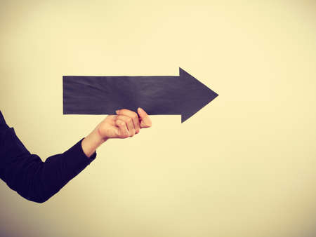 Planning, directions, choices concept. Man holding black arrow pointing right. Indoor shot on light background