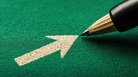 Close up view of pen resting on green surface, with arrow drawn in white pointing upwards. image conveys sense of direction and purpose, ideal for themes of guidance and progress
