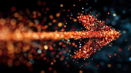 Colorful arrow made of sparkling particles, symbolizing direction and movement, set against dark background filled with vibrant bokeh lights, creating dynamic and energetic atmosphere