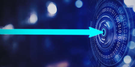Image of blue arrow aiming on the target with binary code in cyberspace with blurred sparkling light background