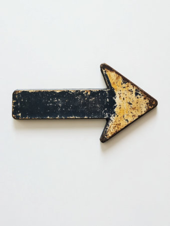 A weathered arrow sign points rightward, showcasing rustic charm with its worn texture and faded colors on a light background.
