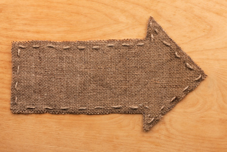 Arrow of burlap lies on wooden background,can be used as texture