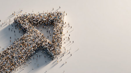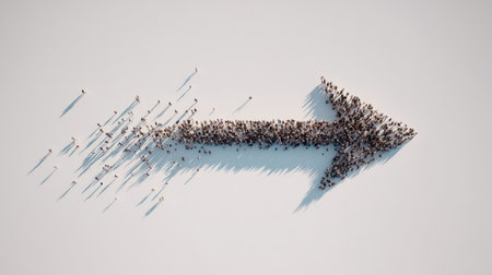 An upward-pointing arrow is constructed from a multitude of tiny figures. The image displays a bright, overhead view with a clean white backdrop. The figures exhibit varying tones, with subtle textures. The scene suggests concepts of progress, development, and collective achievement, suitable for diverse commercial projects.