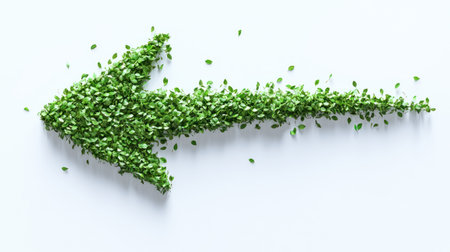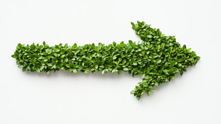 A green leaf arrow points left, symbolizing growth and a connection to nature on a plain backdrop.