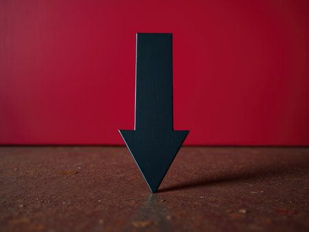 Single downward-pointing arrow on a textured surface against a wall, symbolizing negative trends, challenges, decline, or a difficult path with exceptional realism and detail.