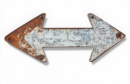 A weathered metal arrow sign directs attention to the left, contrasting against a smooth white wall that adds a minimalist touch.