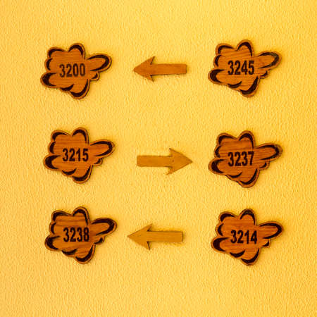 Hotel guide sign on a yellow wall. Arrows and figures.