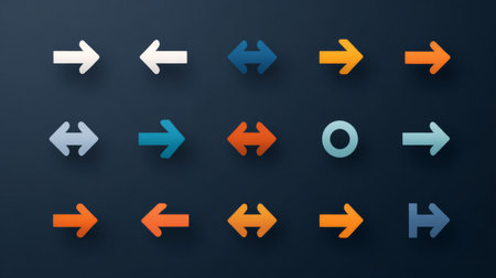 A collection of diverse arrow icons showcased on a dark background, featuring vibrant colors and unique shapes. Ideal for design projects and navigation elements.
