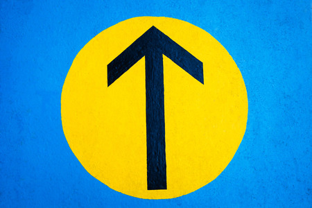 black traffic directional arrow on the yellow circle and blue.