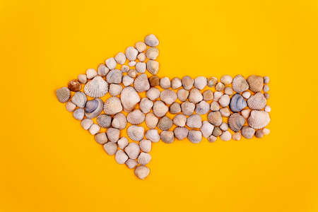 Small seashells in shape of arrow on vivid yellow background imitation of sea sand. Summer holiday and travel concept. Showing direction for rest. Navigation in hotel.