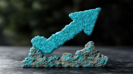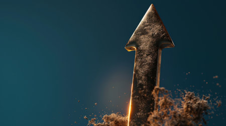 Metallic arrow pointing upwards emerges from cloud of dust, symbolizing growth and progress. contrasting colors create striking visual impact, evoking feelings of motivation and aspiration