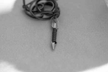 Pendant arrow necklace silver color shoot in a sunny day outside closeup. Selective Focus