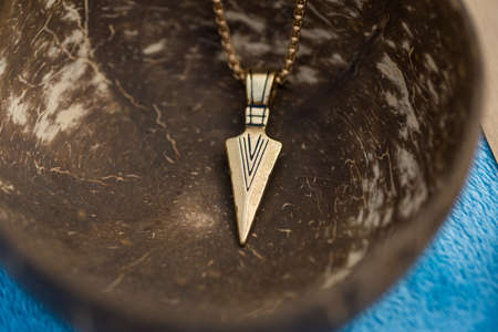Pendant arrow necklace golden color shoot in a sunny day outside closeup. Selective Focus