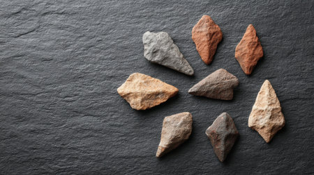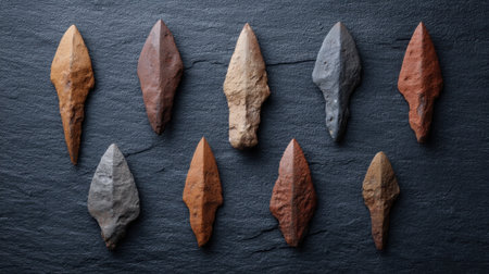 A striking arrangement of colorful natural arrowheads on a dark slate surface, highlighting textures and unique shapes. Perfect for artistic projects or displays.