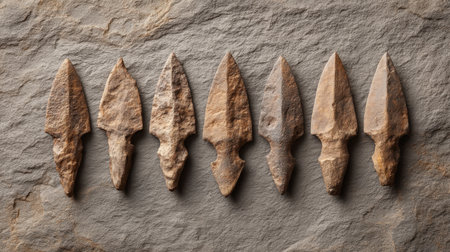 This image features a row of carefully arranged ancient stone arrowheads on a rugged stone surface, highlighting the intricate craftsmanship of prehistoric tools and their cultural significance.