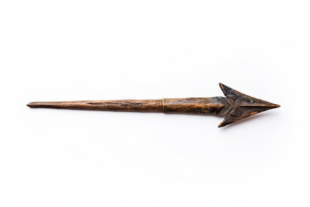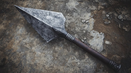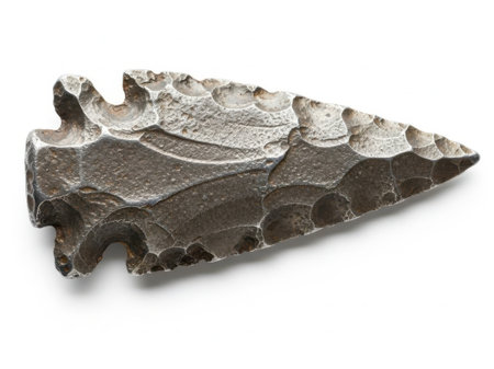 A detailed image of an ancient stone arrowhead, showcasing natural wear and tear, likely crafted by early humans for hunting and survival.