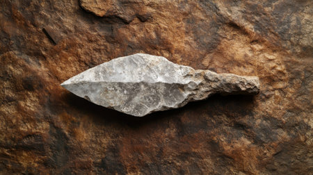 This image showcases an ancient stone tool resting on a rugged brown surface, highlighting its sharp edge and intricate craftsmanship, perfect for historical contexts.