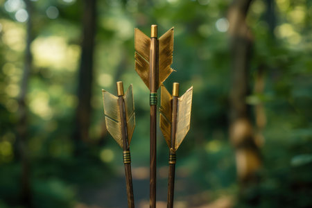 Three arrows are standing upright in a forest, their golden fletching gleaming in the dappled sunlight