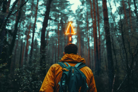 Hiker wearing a yellow jacket and carrying a backpack walks through a forest following a digital floating arrow