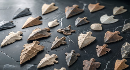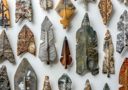 Display of ancient stone arrowheads showcasing various shapes, colors, and textures. Ideal for educational purposes or as a fascinating look into prehistoric craftsmanship.