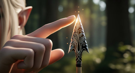 Woman elf interacting with magical glowing arrow. Fantasy concept with enchanted weapon in nature. Illustration for mystic story.