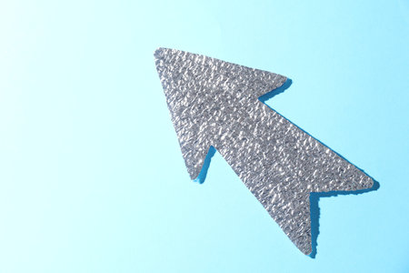 Silver tinfoil arrow on light blue background, top view. Space for text