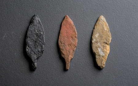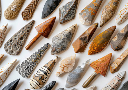 Display of unique stone tools showcases artistry and craftsmanship with earthy colors and textures. Perfect for backgrounds, educational materials, or artistic projects.