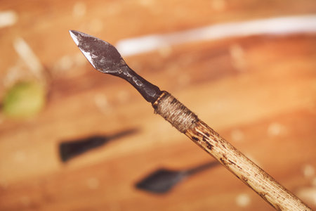 A close-up view reveals the intricate craftsmanship of a primitive stone arrowhead, meticulously fastened to a wooden shaft with natural resin and cordage.