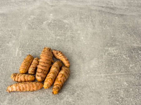 Close up fresh turmeric root (Yellow Root Zedoary, Curcuma longa Linn) stack on wood