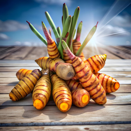 A 3D illustration of a bunch of arrowroot (Maranta arundinacea). also known as tapioca or arrowroot starch. on a wooden surface. This high quality image is perfect for showcasing the beauty and versatility of this plant.