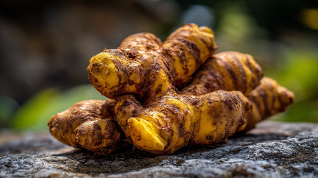 A pile of fresh turmeric root sitting on a stone surface outdoors.