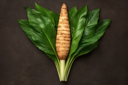 Taro root on taro leaf and dark background, Fresh raw organic taro root ready to cook