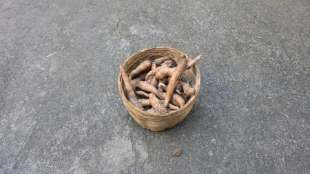 Details of a pile of turmeric that has been harvested before being processed. Turmeric is a spice plant and medicinal plant that is taken from the roots