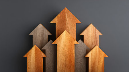 A stylish collection of wooden arrows positioned on a gray background symbolizes growth and direction, perfect for themes related to motivation and progress in various fields.