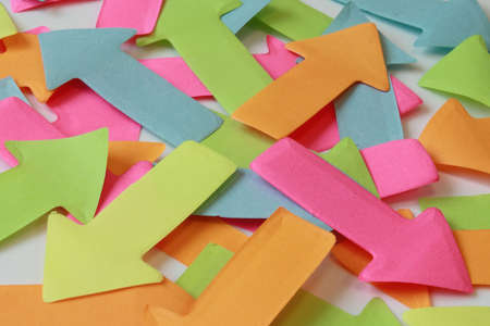 Paper arrows in different directions on a multicolored background. Conceptual image.