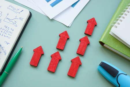 Business success concept with raised red arrows and financial report.
