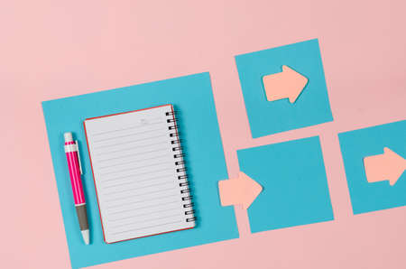 Sheets of a paper, open notebook, arrow bookmarks, pen on pink background. Blue square sheets of paper. Clean notepad on a spring. Top view.