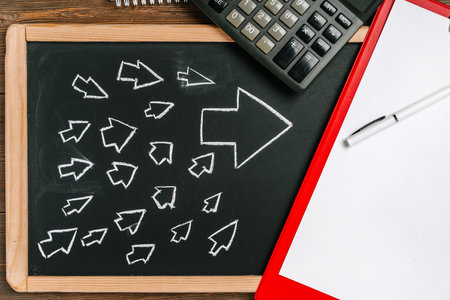 Growth chart with an arrow on a chalkboard, the concept of business solutions and meetings