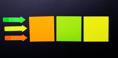 Sticky note papers in shape of arrows on color background
