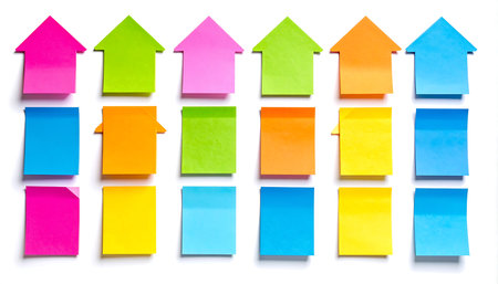 Colorful sticky notes in shape of arrows on white background