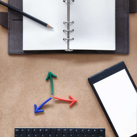 Top view of blank organizer book with pencil, colorful arrow, blank smartphone and mini keyboard on working desk, business concept and input text idea