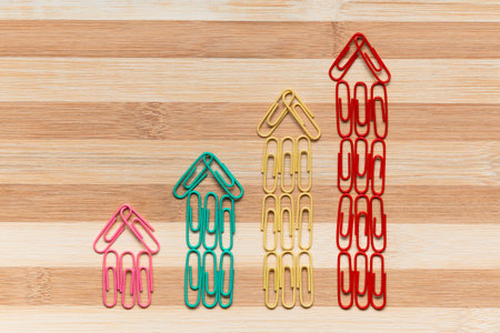 An arrow made from colored paperclips pointing upwards on a white background, shot from above.