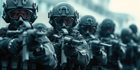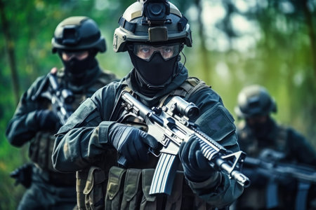 Special military unit with full gear and weapons. Modern infantry force with futuristic weapons and defense system. Soldiers wearing army uniforms and gear with bulletproof helmets. Generative AI.