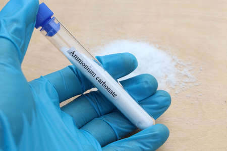 ammonium carbonate in test tube and wood background